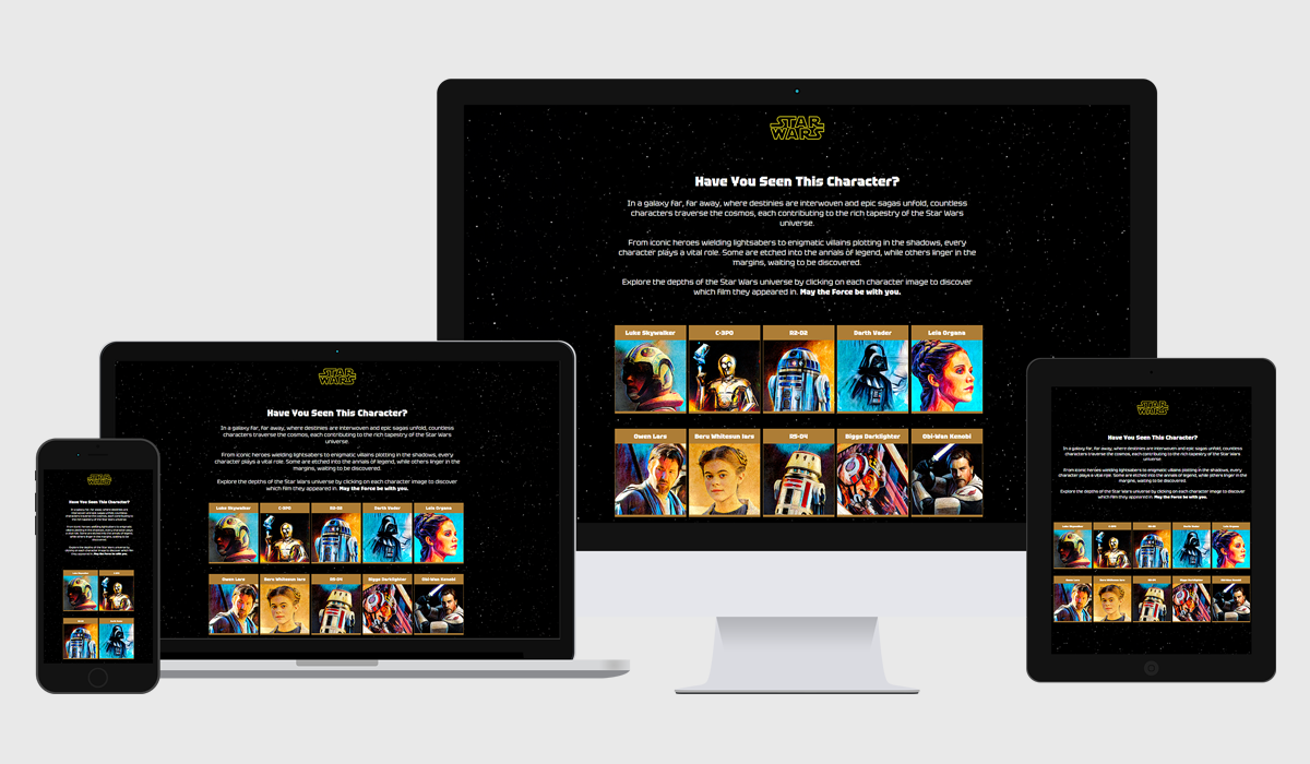 Our solution involved utilizing AJAX requests to fetch character and movie data from the SWAPI, dynamically populating the website's content. Each character's name served as a clickable link, initiating separate AJAX calls to retrieve movie details such as title and opening crawl. Additionally, movie posters were sourced locally from the images folder rather than directly from the SWAPI. GSAP animations were integrated into the characters section, offering dynamic and visually captivating transitions. Furthermore, the website was meticulously designed to be responsive, ensuring an optimal viewing experience across various devices.